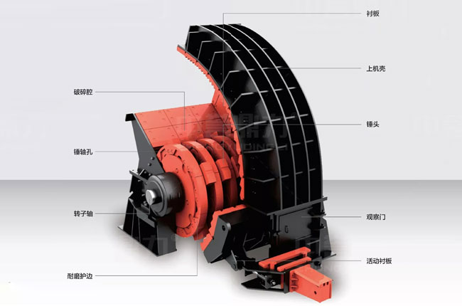 重型錘式破碎機(jī)的結(jié)構(gòu)是由破碎腔、錘軸孔、錘頭、襯板、上機(jī)殼、護(hù)邊、觀察門(mén)、轉(zhuǎn)子軸、活動(dòng)襯板等部件組成的。