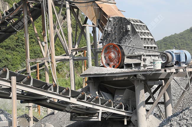 石料粉碎機(jī)由機(jī)殼、轉(zhuǎn)子、反擊襯板、調(diào)節(jié)襯板等部位組成,其中轉(zhuǎn)子是整臺設(shè)備的部位。當(dāng)物料進(jìn)入破碎腔以后,轉(zhuǎn)子上排列整齊的錘頭會在電機(jī)的帶動下甩動起來,對物料進(jìn)行打擊,打擊后的物料四散到機(jī)殼四壁,被鑲嵌在四周的反擊襯板反擊形成二次破碎,同時物料之間也會相互破碎,符合調(diào)節(jié)襯板縫隙的石子會透過出料口完成出料。