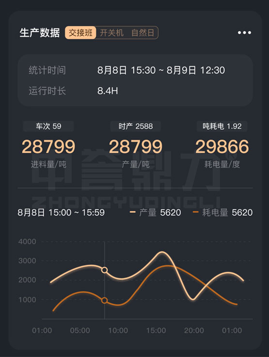 礦山管家APP可查看各類生產(chǎn)數(shù)據(jù),交接班(廠內(nèi)的上下班時間)、開關(guān)機(jī)(班次的開始結(jié)束時間)、自然日(0~24點(diǎn)) 進(jìn)料量(數(shù)據(jù)來自進(jìn)料系統(tǒng))、產(chǎn)量(數(shù)據(jù)來自皮帶秤)、耗電量(數(shù)據(jù)來自智能電表、能耗系數(shù)轉(zhuǎn)換) 產(chǎn)量耗電量趨勢對比曲線等。
