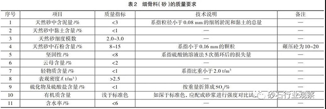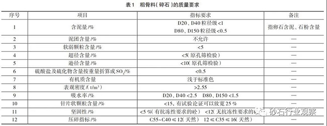 砂石骨料一般分為粗骨料和細(xì)骨料兩種,粒徑大于5mm的為粗骨料,小于5mm的為細(xì)骨料。粗骨料按粒徑80~150mm為特大石,40~80mm為大石,20~40mm為中石,5~20mm為細(xì)石;細(xì)骨料分為粗砂、中砂和細(xì)砂。骨料質(zhì)量管理主要控制粗骨料的遜徑和細(xì)骨料的石粉含量及細(xì)度模數(shù),混凝土用砂石骨料加工,質(zhì)量要求詳見下表。