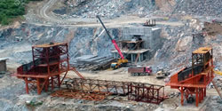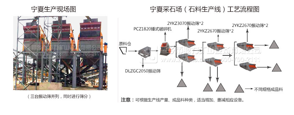 從生產(chǎn)現(xiàn)場圖可以看到,三臺(tái)振動(dòng)篩并駕齊驅(qū),同時(shí)進(jìn)行篩分,可以快速進(jìn)行破碎物料粒度的篩分,從而形成短時(shí)間、率、產(chǎn)量高的大中型砂石骨料生產(chǎn)線。