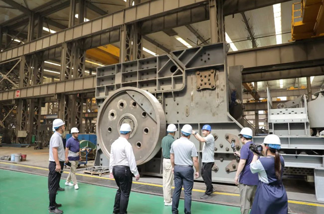 中譽鼎力集團副董事長馬鈺博、技術總監(jiān)劉海淘在智能化車間為砂石骨料網(wǎng)考察團成員一一介紹了集團主營產(chǎn)品及其制造工藝,并對硬巖設備代表產(chǎn)品臥式旋回破碎機進行了詳細的講解。