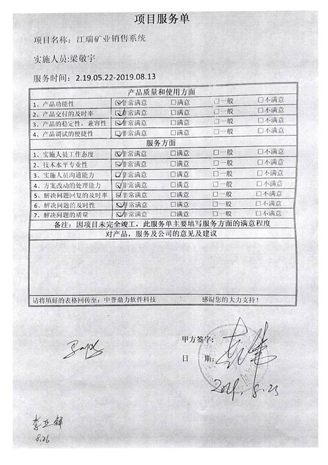 在中譽(yù)鼎力軟件科技股份有限公司,有一張“項(xiàng)目服務(wù)單”。這薄薄的一頁紙,記載了中譽(yù)鼎力員工去客戶現(xiàn)場(chǎng)進(jìn)行智能礦山管理系統(tǒng)安裝、維護(hù)、售后、問題解決等各項(xiàng)細(xì)節(jié);也是中譽(yù)鼎力員工精細(xì)的施工品質(zhì)、完善規(guī)范的管控機(jī)制,以及追求客戶滿意的服務(wù)理念的真實(shí)寫照。