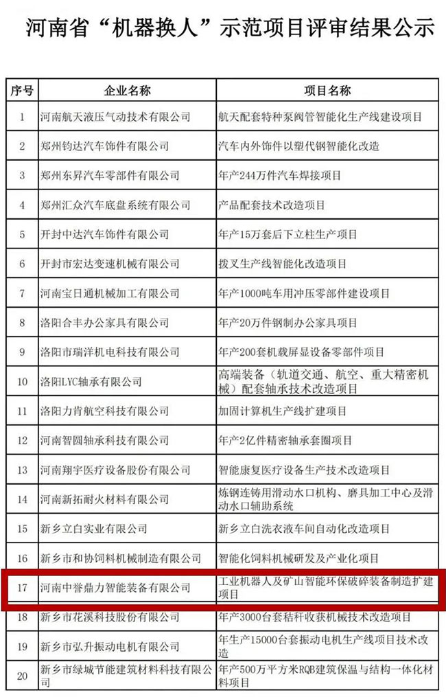其中,河南中譽(yù)鼎力智能裝備有限公司工業(yè)機(jī)器人及礦山智能環(huán)保破碎裝備制造擴(kuò)建項(xiàng)目成功通過評審。
