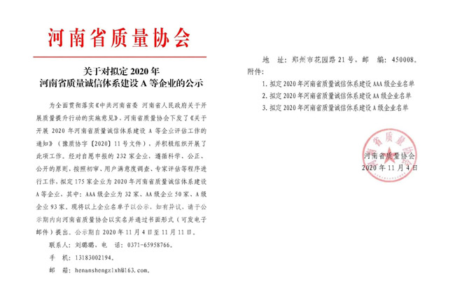 為面貫徹落實《中共河南省委河南省人民關于開展質(zhì)量提升行動的實施意見》,河南省質(zhì)量協(xié)會下發(fā)了《關于開展2020年河南省質(zhì)量誠信體系建設A等企業(yè)評估工作的通知》(豫質(zhì)協(xié)字[2020]11號文件),中譽鼎力軟件科技股份有限公司積參評。公司自成立以來,堅持“一言九鼎誠信天下”的經(jīng)營理念,秉持對客戶負責的態(tài)度,以工匠精雕鑄鼎力品質(zhì),不斷開拓公司業(yè)務,樹立了守法履約的良好企業(yè)形象和客戶口碑,入選“2020年河南省質(zhì)量誠信體系建設AA級企業(yè)”名單。