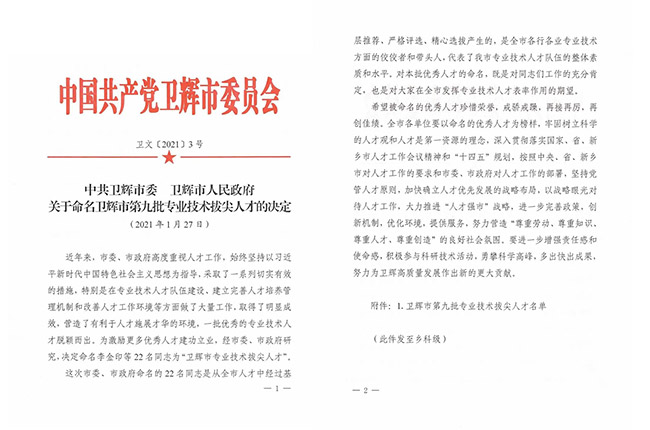 2021年1月27日,衛(wèi)輝市委、市發(fā)布《關(guān)于命名衛(wèi)輝市第九批技術(shù)拔尖人才的決定》。中譽(yù)鼎力董事長(zhǎng)張永、河南中譽(yù)鼎力智能裝備有限公司技術(shù)中心部長(zhǎng)劉海淘被任命為“衛(wèi)輝市技術(shù)拔尖人才”!