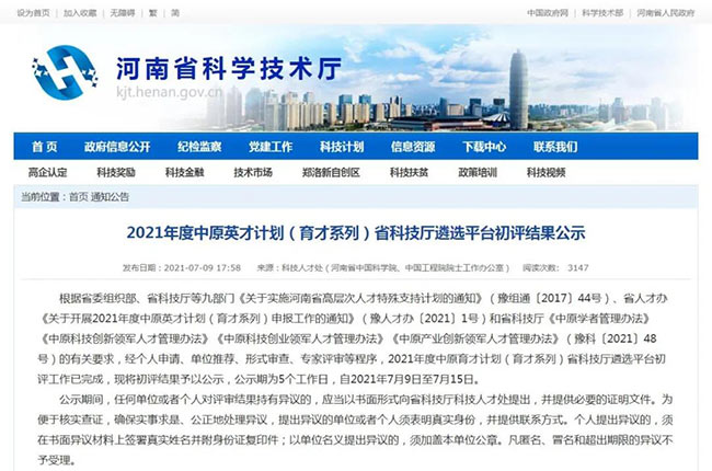 根據(jù)河南省委組織部、省科技廳等九部門《關(guān)于實(shí)施河南省高層次人才支持計(jì)劃的通知》(豫組通〔2017〕44號)、省人才辦《關(guān)于開展2021年度中原英才計(jì)劃(育才系列)申報工作的通知》(豫人才辦〔2021〕1號)和省科技廳《中原學(xué)者管理辦法》《中原科技創(chuàng)新軍人才管理辦法》《中原科技創(chuàng)業(yè)軍人才管理辦法》《中原產(chǎn)業(yè)創(chuàng)新軍人才管理辦法》(豫科〔2021〕48號)的有關(guān)要求,經(jīng)個人申請、單位、形式審查、評審等程序,7月9日,2021年度中原育才計(jì)劃(育才系列)省科技廳遴選平臺初評工作完成,并將結(jié)果予以公示。