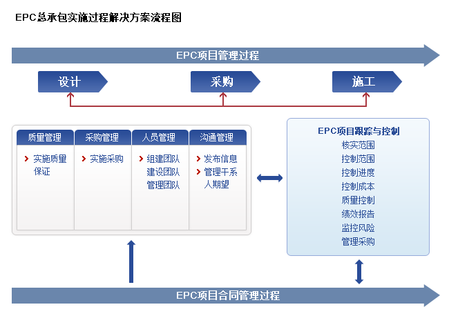 所謂EPC工程總承包項(xiàng)目指的是公司受到業(yè)主的委托,按照合同的約定對(duì)工程建設(shè)項(xiàng)目的設(shè)計(jì)、采購、施工、試運(yùn)行等過程或者是若干階段的承包,并對(duì)整體工程的質(zhì)量、安、費(fèi)用、進(jìn)度等權(quán)負(fù)責(zé)。