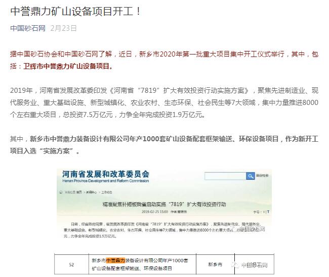 報道鏈接:中譽鼎力礦山設備項目開工!