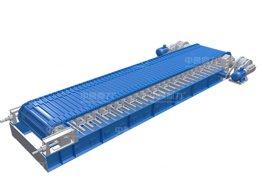 電動(dòng)機(jī)轉(zhuǎn)動(dòng),通過傳動(dòng)軸和驅(qū)動(dòng)裝置,帶動(dòng)主軸旋轉(zhuǎn),鏈輪和鏈條安裝在主軸裝置上,通過該裝置帶動(dòng)鏈條上的鏈板做直線運(yùn)動(dòng),鏈條上安裝有承料槽板,鏈板的直線運(yùn)動(dòng)將物料均勻的帶到鏈條的槽板上,并向前輸送,達(dá)到輸送物料的目的。