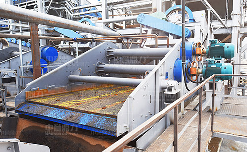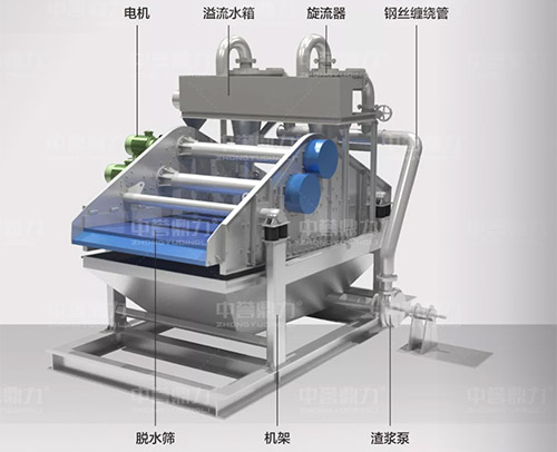 中譽(yù)鼎力細(xì)砂回收脫水一體機(jī)由旋流器、溢流水箱、鋼絲纏繞管、電機(jī)、脫水篩、機(jī)架、渣漿泵等組成,在工作時(shí),渣漿泵將篩水混合物輸送到旋流器中,細(xì)砂經(jīng)沉沙嘴進(jìn)入到下方的脫水篩中,經(jīng)脫水篩脫水后,細(xì)砂與水實(shí)現(xiàn)分離,剩余的少量細(xì)砂和泥等雜質(zhì),經(jīng)過(guò)溢流水箱進(jìn)入污水處理系統(tǒng),沉淀后進(jìn)行水資源再次利用。