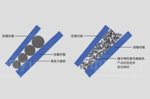 通過(guò)采用粒間層壓原理設(shè)計(jì),利用物料間相互擠壓,扁長(zhǎng)物料先被破碎,可以提高破碎效率和細(xì)料比例,在很大程度上減少針片狀物料,產(chǎn)品粒形好,并且易損件鋼耗;