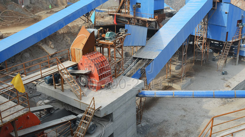 此條生產(chǎn)線時(shí)產(chǎn)700噸;基本配置:PCZ1615重型錘式破碎機(jī)、PC1512錘式破碎機(jī)、ZG2038給料機(jī)、3YKZ3070×2振動(dòng)篩、2YKZ3070×2振動(dòng)篩。