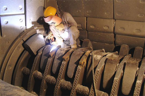 我們采用熱復(fù)合雙金屬高鉻合金錘頭,此材質(zhì)強(qiáng)度高,破碎石灰石可達(dá)80—120萬(wàn)噸。