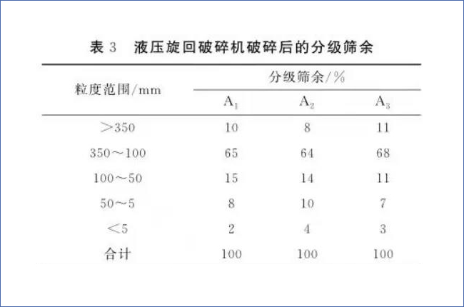根據(jù)以上數(shù)據(jù),傳統(tǒng)旋回破碎機及顎式破碎機通常情況下的出料均為350mm左右。而中譽鼎力DLHGC臥式旋回破碎機成功實現(xiàn)了成品料小于200mm的粒度要求,擁有更大的破碎比,甚至可以將傳統(tǒng)的三級硬巖破碎工藝簡化為兩級工藝,設備優(yōu)勢顯著。