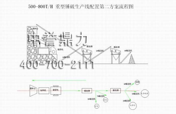 石料進(jìn)入原料倉(cāng),由振動(dòng)給料機(jī)均勻地送到錘式破碎機(jī)中進(jìn)行破碎,破碎后的物料由1號(hào)膠帶輸送機(jī)送到快速道振動(dòng)篩上篩分出各種不同規(guī)格的石子,其中1-2、1-3規(guī)格成品由7號(hào)、8號(hào)輸送機(jī)送出,其他規(guī)格的物料再由2號(hào)輸送機(jī)送到道振動(dòng)篩上篩分出石粉、0.3-0.6、0.5-1等各規(guī)格的物料,分別由4號(hào)、5號(hào)、6號(hào)輸送機(jī)送入成品倉(cāng),經(jīng)快速道振動(dòng)篩過(guò)濾出的達(dá)不到成品粒度要求的物料則由3號(hào)輸送機(jī)從快速道振動(dòng)篩上送返回破碎機(jī)重新加工,這樣反復(fù)循環(huán)。