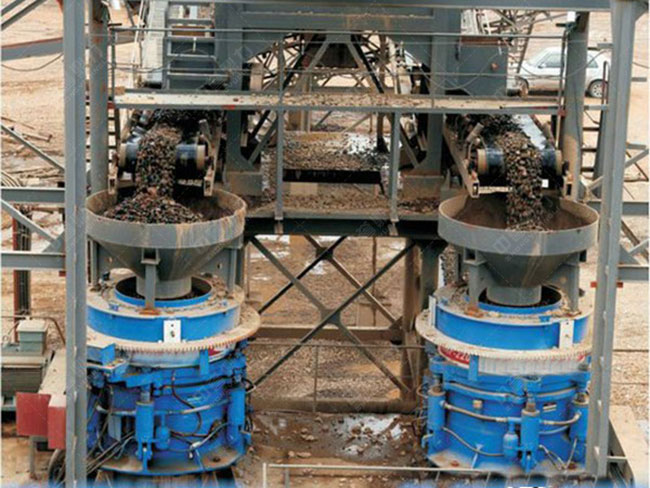 500TPH型號(hào)PCZ1615,處理量380-550噸/時(shí),送料規(guī)格不大于600毫米,成品可達(dá)5毫米左右。